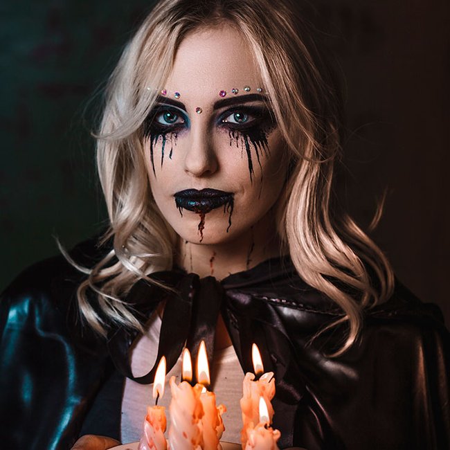 Transformar uma maquiagem comum em uma make de bruxa é mais fácil do que parece. Basta adicionar mais drama aos olhos com sombras escuras e delineador e lápis de olho, clarear a pele com uma base de cobertura total e escolher um batom escuro para os lábios. Não se esqueça de adicionar um pouco de contorno para realçar as maçãs do rosto e o nariz.